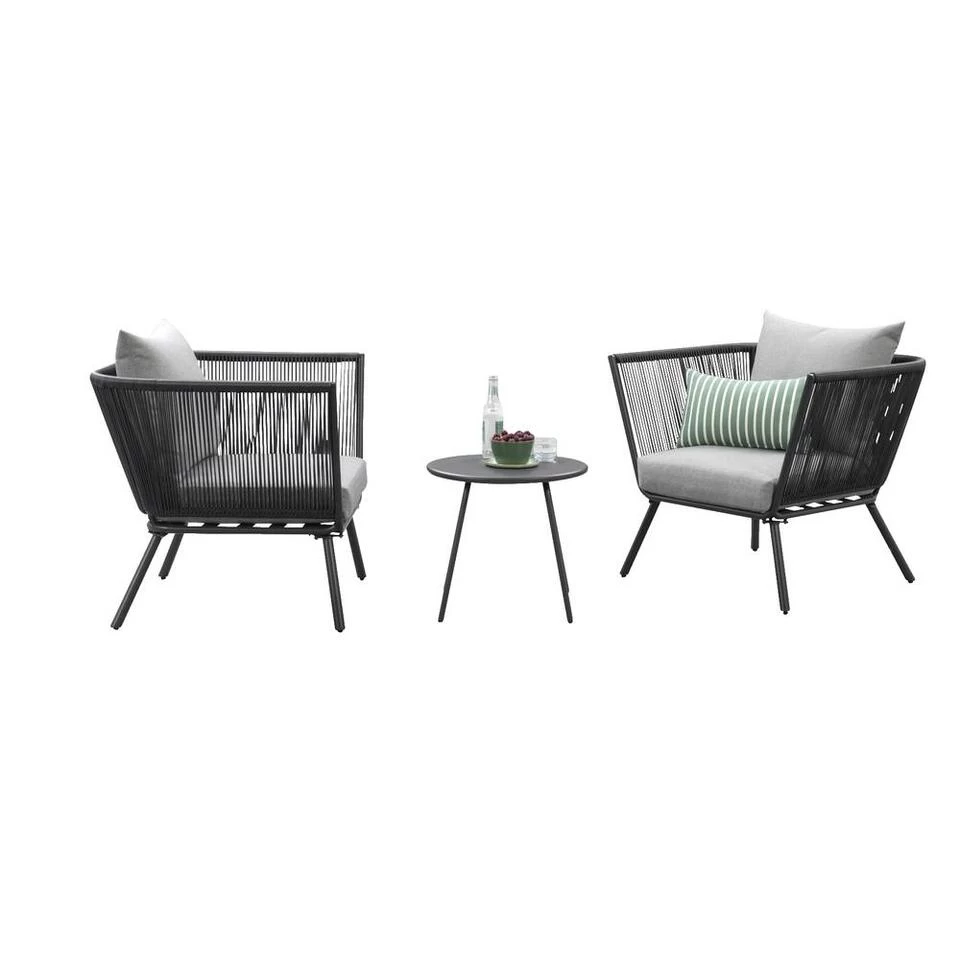 Deze loungeset bestaat uit een bijzettafel en 2 loungefauteuils. Deze tuinmeubelen zijn gemmaakt van antracietkleurig metaal. Dit zorgt ervoor dat de Almeria meubelen een moderne en stoere uitstraling hebben. Deze balkonset wordt geleverd inclusief heerlijke comfortabele grijze loungekussens. De Almeria set is gecombineerd met 1 ronde Vilanova bijzettafel. Deze tafel is antraciet van kleur en gemaakt van metaal. Door het gebruik van weerbestendige en onderhoudsarme materialen is deze loungeset perfect voor buiten gebruik. En natuurlijk de perfecte keus als je wilt genieten van mooie, stijlvolle meubelen, maar geen tijd kwijt wilt zijn aan het onderhoud.