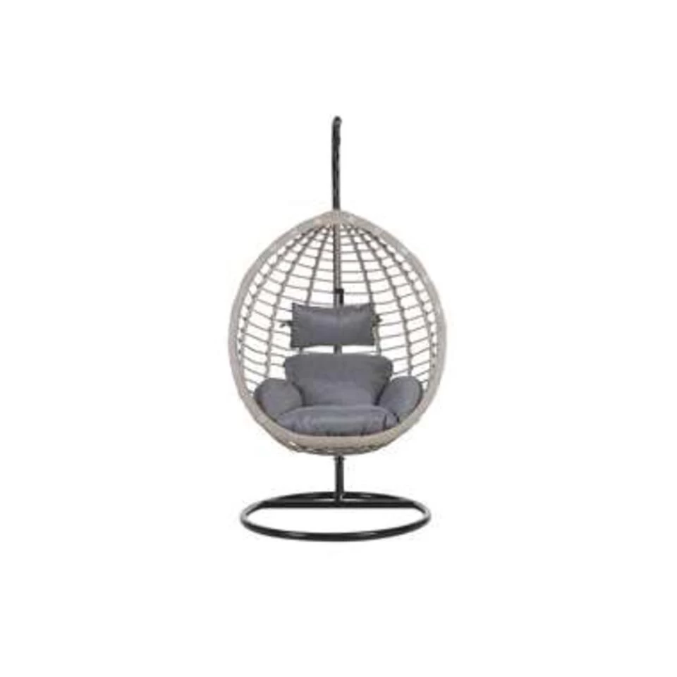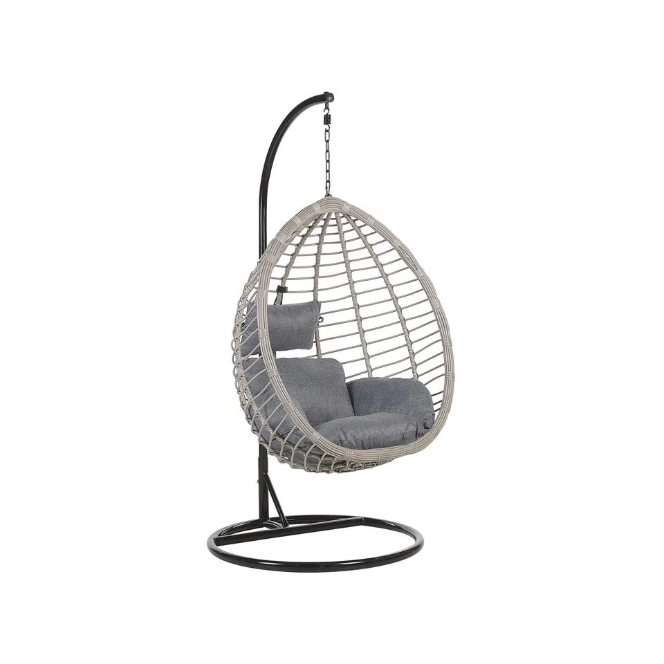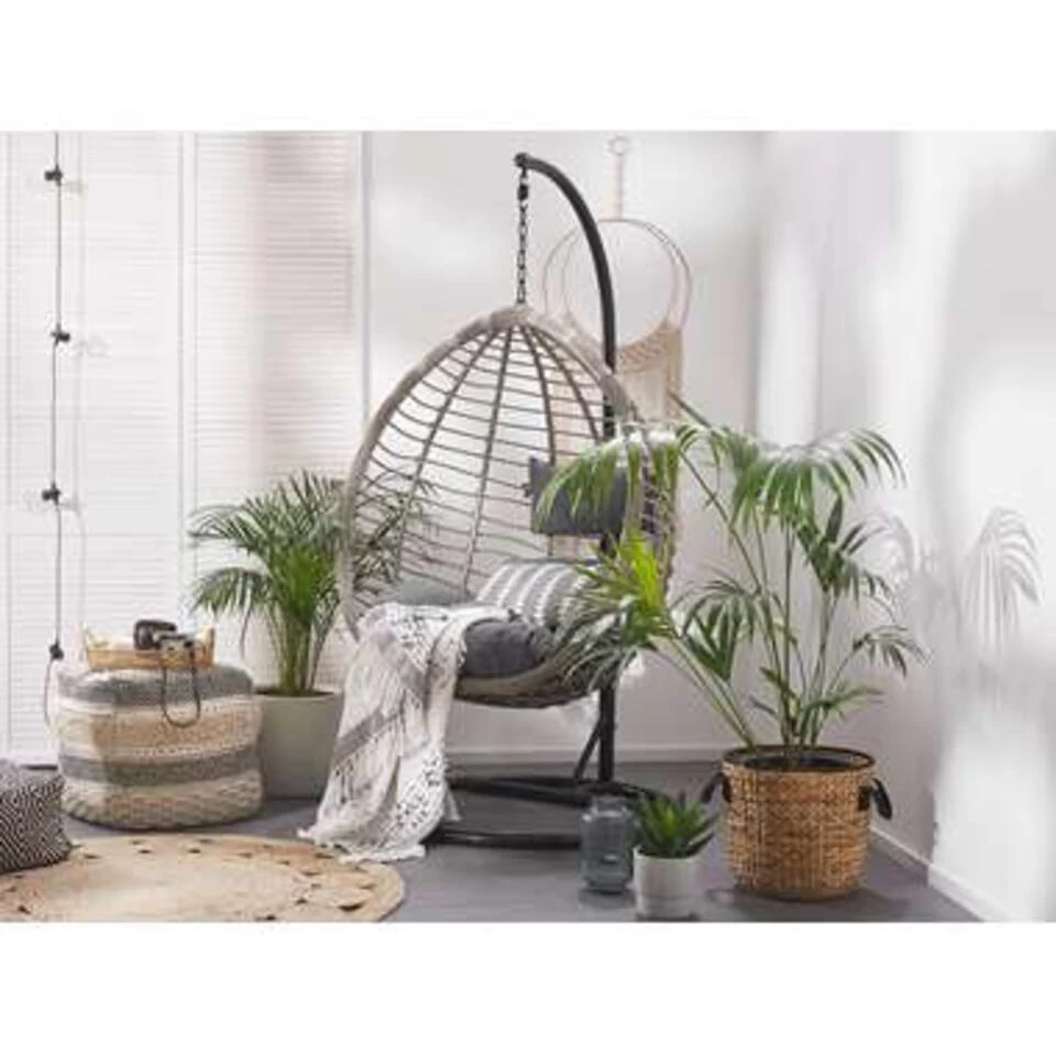 Rotan hangstoel in stevig zwart metalen frame inclusief kussens. In woonkamer, wintertuin of balkon – deze stijlvolle hangstoel van onderhoudsvriendelijk polyrotan heeft een stabiel stalen frame en kan daardoor overal geplaatst worden. De mand is stevig bevestigd via een ketting waardoor hij zachtjes wiegen. De twee comfortabele, stevige kussens zijn waterbestendig.