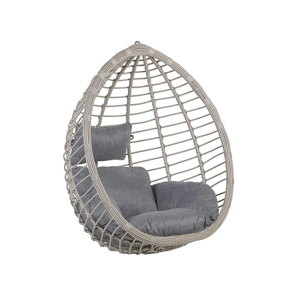 Moderne hangstoel voor binnen en buiten gemaakt van rotan inclusief kussens. Deze mooie rotan hangstoel met een boho-uitstraling past in elk interieur en staat geweldig op je balkon of terras. De dik gewatteerde, waterbestendige kussens in grijs zijn zeer comfortabel en maken van de stoel een perfecte plek om te schommelen, ontspannen of lezen.