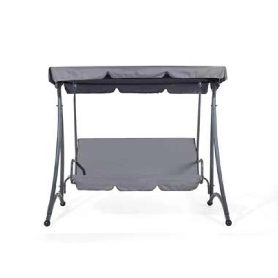 Schommelbank – donkergrijs – Temple. Deze schommelbank betovert door zijn zachte kleuren en zijn strakke vorm, die door het zonnedak wordt vervolmaakt. Deze is niet alleen op esthetische gronden toegevoegd, maar ook om je te beschermen tegen de sterke zonnestraling. Het zonnedak aan de schommel verzekert je van een koele schaduw, zo kun je aangenaam schommelen en ontspannen. Voor optimaal comfort zijn zitkussens toegevoegd, want deze hebben een bijzonder zachte vulling en zijn met stof bekleed. Opdat je je veilig voelt op de schommelbank, is hij voorzien van een bijzonder stabiel onderstel. Deze bestaat uit gepoedercoat staal, wat zeer robuust, weersbestendig en ook onderhoudsarm is. Wanneer je lekker wilt genieten van deze zomer, schaf dan beslist een schommelbank aan!