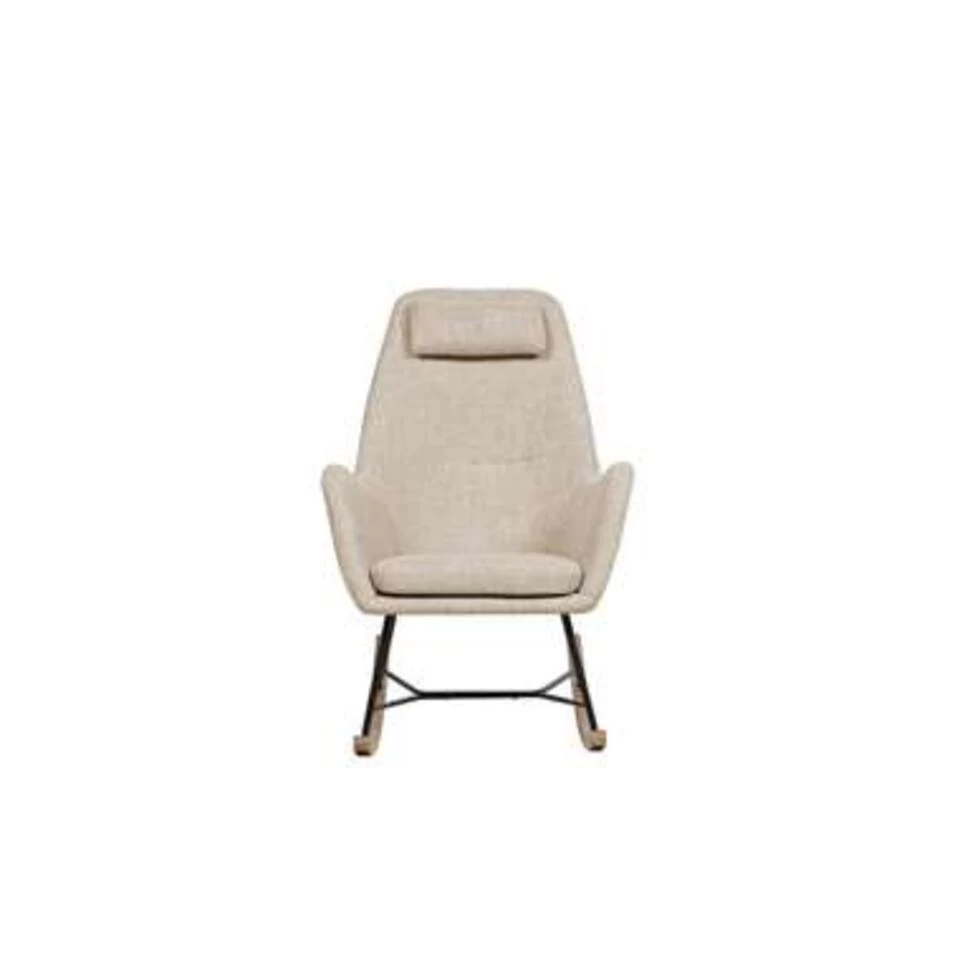 Moderne schommelfauteuil in lichtbeige. De klassieke schommelstoel, maar dan net even anders. Deze fauteuil combineert het concept van een klassieke schommelstoel met een moderne zitting. De stoel is comfortabel dankzij het extra kussentje als hoofdsteun en de zachte bekleding. De perfecte zetel om in de kinderkamer of voor de haard te zetten.