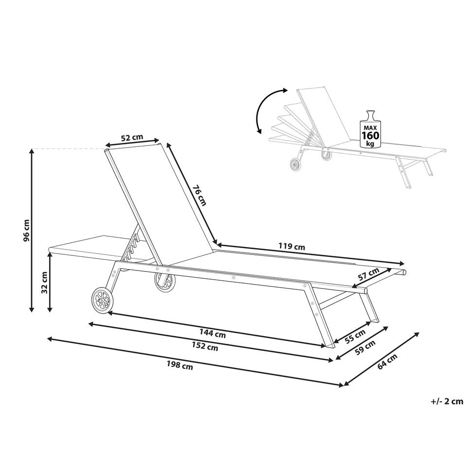 Belangrijkste eigenschappen: Rugleuning verstelbaar in 6 posities, Verrijdbare poten voor het eenvoudig verplaatsen, Zeer comfortabel, Modern terras- en tuinmeubilair, UV-bestendigheidsklasse, Beschermdoppen voor oppervlaktebescherming