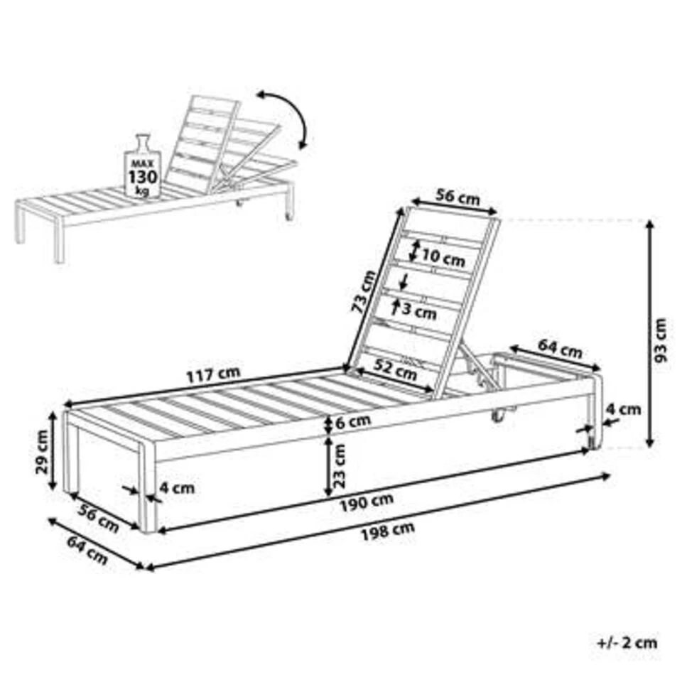 Belangrijkste eigenschappen: Rugleuning in 4 posities verstelbaar, soepel rollende nylon wieltjes, UV-bestendigheidsklasse, Roestvrijstalen frame, Weersbestendig materiaal, Rugleuning verstelbaar tot horizontale positie