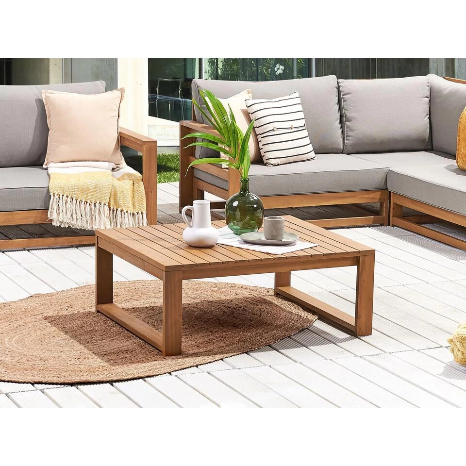 Houten salontafel voor buiten. Deze stijlvolle tafel in moderne stijl is een praktische aanvulling op balkon of tuin. Het is gemaakt van hoogwaardig acaciahout, waardoor het stevig en stabiel is. De tijdloze uitstraling van de tafel zorgt ervoor dat hij goed past bij moderne en traditionele tuinmeubelen.