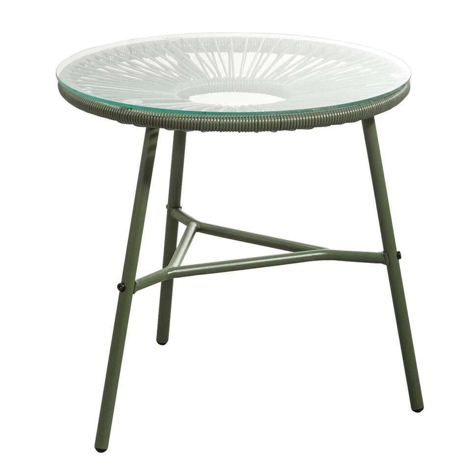 Dit ronde bijzettafeltje is gemaakt van metaal en kunststof. Het heeft een glazen blad, waardoor je veilig je lekkerste drankjes erop kunt zetten. Door dit onderhoudsvrije materiaal is dit bijzettafeltje geschikt voor zowel binnen als buitengebruik. De olijfgroene kleur past helemaal bij de natuurlijke/botanische stijl van dit seizoen. En zorgt tegelijkertijd voor kleur en warmte in je interieur. Het tafeltje is compact en handzaam, waardoor je het makkelijk kunt verplaatsen.