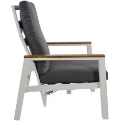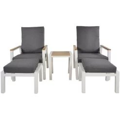 Geef uw favoriete buitenruimte een echte make-over met duoset Coda! Deze luxueuze set komt uit de collectie van het merk Les en bestaat uit twee loungestoelen, twee hockers en een loungebijzettafel. Het frame van zowel de stoelen, de hockers als de bijzettafel is uitgevoerd in stevig en onderhoudsvriendelijk aluminium met een matte witte kleur als afwerking. Opvallend aan het ontwerp van deze set zijn de aluminium details met een teaklook voor een natuurlijke touch. Verder zijn beide stoelen en de hockers voorzien van grijze kussens (270gr/m² olefin) en is de rugleuning van elke stoel kantelbaar. Plaats duoset Coda in de tuinkamer of op het terras en geniet van zijn design en comfort. Ook verkrijgbaar in het donkergrijs. Afmetingen Loungestoelen: B68xD85xH102 cm Hockers: B57xD55xH36 cm Loungebijzettafel: B45xD45xH50 cm