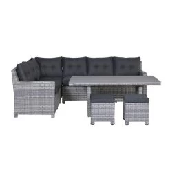 Deze lounge dining set is vervaardigd uit een onderhoudsvrij aluminium frame met daaromheen weerbestendig L-shape wicker draad, waardoor je het hele jaar kunt genieten van deze mooie lounge dining set. Het wicker is gemaakt van een stevig kunststof waardoor de set zeer duurzaam is. De ruime bijpassende lounge dining tafel is voorzien van een mooi polywood tafelblad. Polywood zijn “houtlook” latten, dit is een onderhoudsvriendelijke kunststof met een mooie houtstructuur.