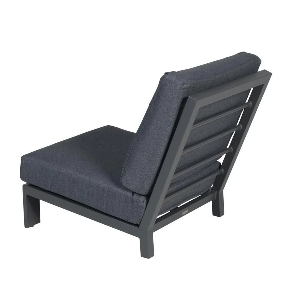 Het lounge midden element is compleet gemaakt van aluminium en heeft een stevige zwarte poedercoating. Dit aluminium frame is onderhoudsvrij en weerbestendig. De meegeleverde dikke polyester kussens zijn voorzien van een rits. De hoes is afneembaar en kan eenvoudig met de hand gewassen worden. De kussens zijn niet waterbestendig, maar wel waterafstotend. Stel dat er drinken op het midden element gemorst wordt, dan kan dit er gemakkelijk afgeveegd worden.