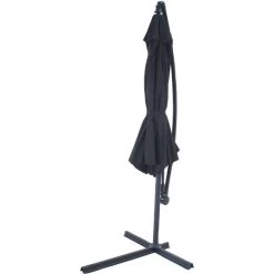 De zweefparasol is verticaal te kantelen en 360 graden rond te draaien. Ideaal om met de zon mee te bewegen zonder de hele parasol te moeten verplaatsen. Bij deze zweefparasol moet minimaal een 80 kg hawaii parasolvoet. De zweefparasol is licht van gewicht en kan makkelijk opgeborgen worden in de schuur wanneer er slecht weer aan komt. Doe je de parasol ’s avonds dicht dan kun je er een hoes over heen doen, die los aangeschaft kan worden. Het parasoldoek heeft een donker grijze kleur.