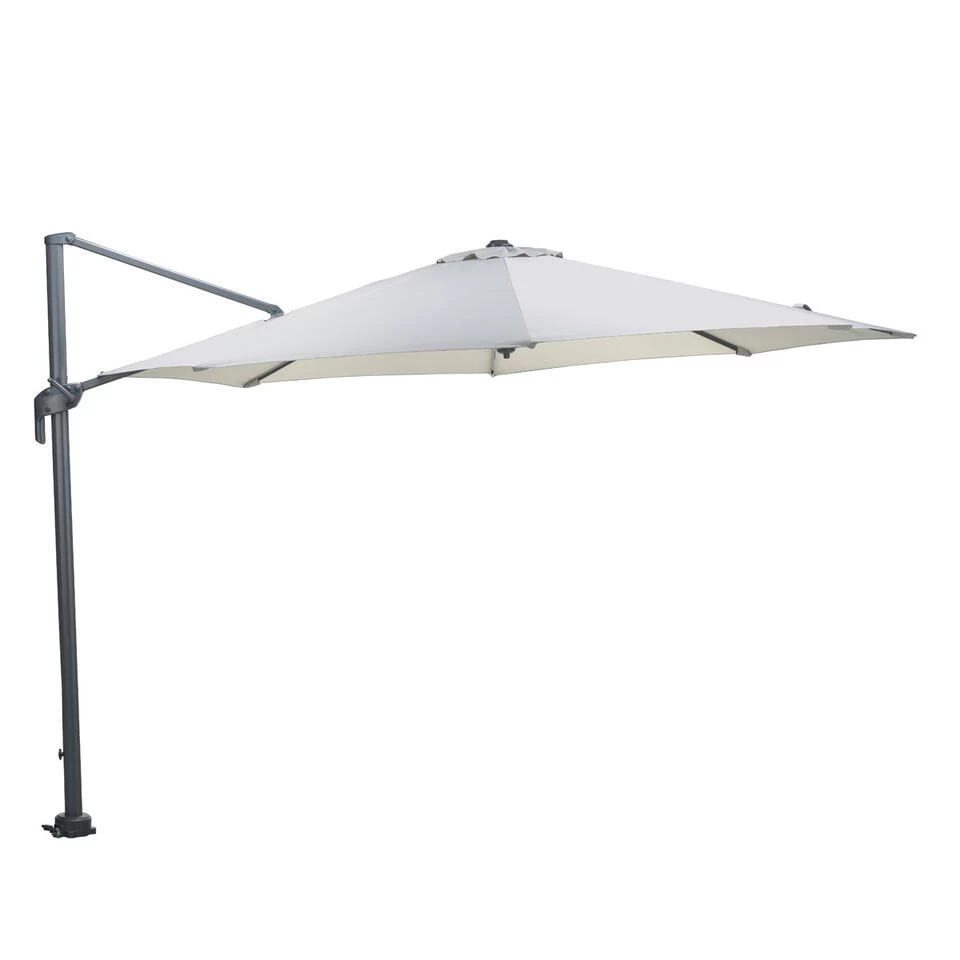 Zo is het frame gemaakt van stevig aluminium met een donker grijze coating. Het doek is gemaakt van 200 grams polyester en ook nog eens voorzien van een brandwerende PA-coating. De zweefparasol is verticaal te kantelen en 360 graden rond te draaien.