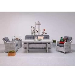 De Nova lounge dining is een zeer ruime stoel waar je heerlijk breed in kunt zitten. In deze stoel zit iedereen heerlijk. Of je nu lekker een boek wilt lezen, lekker wilt genieten van de zon of wilt dineren, deze stoel is er geschikt voor. De Nova lounge dining stoel is vervaardigd uit een onderhoudsvrij aluminium frame en weerbestendig half rond wicker kunststof vlechtwerkdraad in de kleur cloudy grey. Het draad heeft een dikte van maar liefst 5mm, wat zorgt voor een mooie robuuste uitstraling. Wicker is een stevig en duurzaam kunststof, waardoor je jarenlang kunt genieten van deze stoel. Het zit- en rugkussen is gemaakt van een hoogwaardige kwaliteit polyester. Het zitkussen is voorzien van een rits, waardoor het hoesje gemakkelijk met de hand gewassen kan worden. De rugkussens zijn voorzien van extra stiksels waarmee de stof op twee plekken naar elkaar wordt getrokken, wat zorgt voor een klassieke uitstraling. Deze stijlvolle look is geïnspireerd op de bekende klassieke chesterfield banken. Na gebruik kunnen de kussens opgeborgen worden in de schuur of een mooie kussenbox. Uiteraard kan de Nova lounge dining stoel los worden gekocht. Met bijvoorbeeld een bijzettafeltje in hetzelfde kleur vlechtwerk draad creëer je een gezellig plekje. Zie je jezelf al zitten met een bakje koffie in de ochtendzon? Daarnaast kan de Nova stoel gecombineerd worden met andere tuinmeubels uit de Nova serie, zoals: een driezits bank, lounge dining tafels, krukjes, lounge midden elementen en zelfs met een ruime hoekbank opstelling. En natuurlijk zijn al deze artikelen leverbaar in diverse kleurstellingen. De afmetingen van de stoel zijn: L 74 x D 72 x H 85 cm. Een uitgebreide collectie loungestoelen vind je binnen de categorie tuinmeubelen. Tuinmeubelen van verschillende mooie merken.