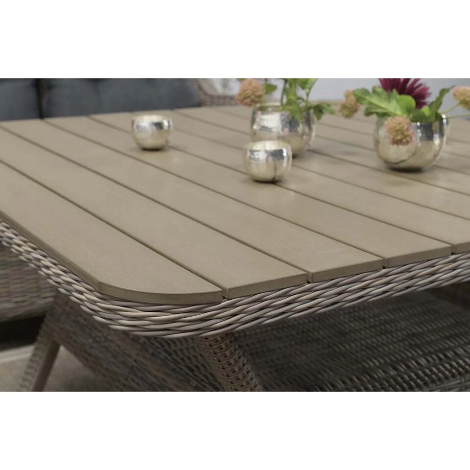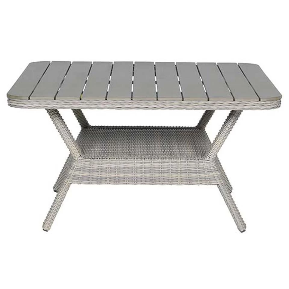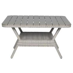 De Nova lounge dining tafel is een heerlijke tafel om te combineren bij bijvoorbeeld de Nova hoekbank opstelling, aangevuld met de Nova dining stoelen of krukjes. De Nova lounge dining tafel is vervaardigd uit een onderhoudsvrij aluminium frame met daaromheen hand gevlochten 6,5mm half rond kunststof wicker in de kleur vintage willow. Het tafelblad is gemaakt van polywood ‘houtlook ‘ latten, dit is onderhoudsvriendelijk kunststof. Aan de onderkant van de tafel, halverwege de poten is nog een plateau wat zorgt voor een extra luxe uitstraling. Daarnaast kun je er ook nog spullen op leggen zoals boeken en tijdschriften. Dat is handig! Wil je niet alleen de Nova lounge dining tafel, maar naar eigen wens een mooie set opstelling samenstellen? Bij de Nova serie is het mogelijk. De Nova serie bestaat namelijk uit: losse banken, tafels, stoelen, krukjes en complete hoekbank opstellingen zijn mogelijk. En natuurlijk zijn al deze artikelen leverbaar in diverse kleurstellingen. De afmetingen van deze tafel zijn: L 126,5 x B 126,5 x H 70 cm. Een uitgebreide collectie tuintafels vind je binnen de categorie tuinmeubelen. Tuinmeubelen van verschillende mooie merken.