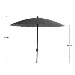 Na gebruik van de parasol kan je deze beschermen met een parasolhoes welke los aangeschaft kan worden. Hierdoor kun je de parasol tijdens zonnige dagen prima buiten laten staan. Bij slecht weer til je de zweefparasol gemakkelijk van de voet en berg je deze op in de schuur. Deze parasol heeft een Aluminium frame in de kleur royal grey met een polyester donker grijs kleurig parasoldoek. De totale hoogte is 240 cm, waarvan de doek hoogte 200 cm is en 250 cm in diameter.