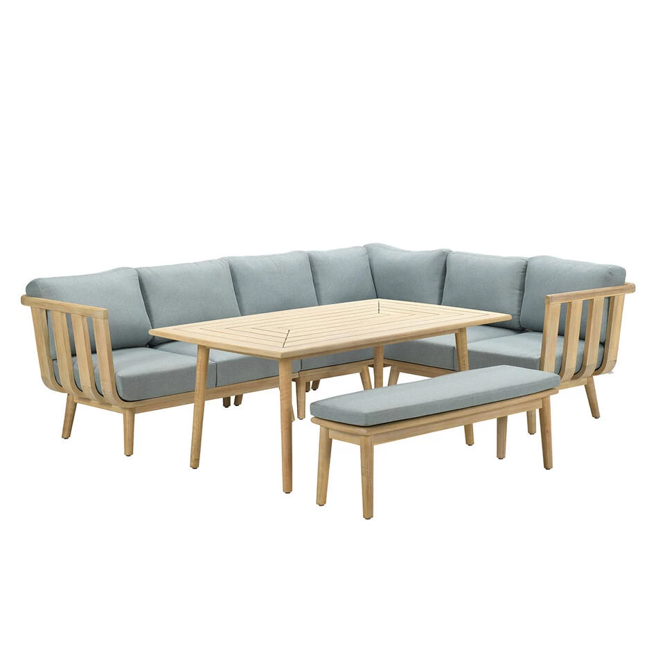 De San Leone lounge dining set 6-delig mint grijs heeft een comfortabele zit en een mooie unieke uitstraling. Deze gehele lounge dining set is gemaakt van acacia hout. Het tafelblad heeft een prachtig patroon en het frame van de bank is robuust. Deze lounge dining set biedt maar liefst plaats voor acht personen. Zo kun jij heerlijk genieten van een barbecue met vrienden of familie. Deze prachtige hoek loungeset van het kwaliteitsmerk Garden Impressions is een eyecatcher voor in de tuin.