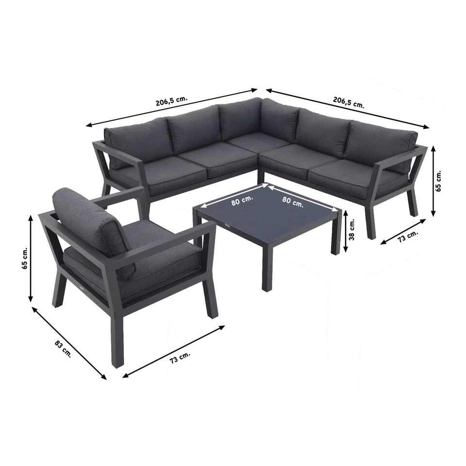 De loungebank heeft een afmeting van 206,5 cm lengte, 207,6 cm breedte en een hoogte van 65 cm. De loungestoel heeft een afmeting van 83 cm breedte, is 73 cm diep en is 65cm hoog. De loungetafel heeft een afmeting van 80 cm bij 80 cm en een hoogte van 38 cm.