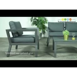 Het frame van de loungeset is van aluminium en is voorzien van een poedercoating. Deze coating zorgt voor een stoot- en kras vaste laag. Deze coating in de kleur carbon black zorgt voor een luxe uitstraling van de San Luis loungeset. Het aluminium is eenvoudig met een zachte doek schoon te maken en een sopje van groene zeep. De loungeset kan eventueel uitgebreid worden met extra fauteuils of een bijzettafel.