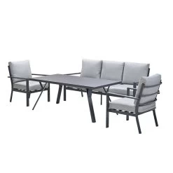 De Senja lounge dining set is gemaakt van een onderhoudsvrij en weerbestendig aluminium met een stevige donker grijze poedercoating.