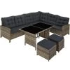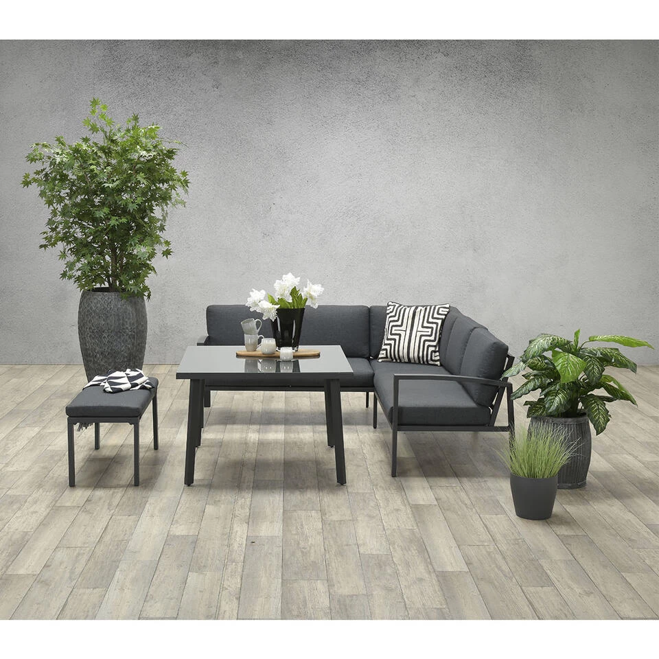 De donker grijze Tropea lounge dining set biedt plaats aan zeven personen en is door het aluminium licht van gewicht. De loungeset is voorzien van comfortabele kussens en heeft mooie rondingen in de armleuningen. De zitting is van textileen, wat ook weer voor extra zitcomfort zorgt. Een echte aanwinst voor in de tuin. Het frame van de Tropea lounge dining set is gemaakt van een onderhoudsvrij en weerbestendig aluminium. Dit aluminium heeft een stevige laag van poedercoating. Deze stevige coating zorgt ervoor dat het frame beschermt is tegen krassen en stoten. Aluminium is licht van gewicht en daardoor eenvoudig te verplaatsen.