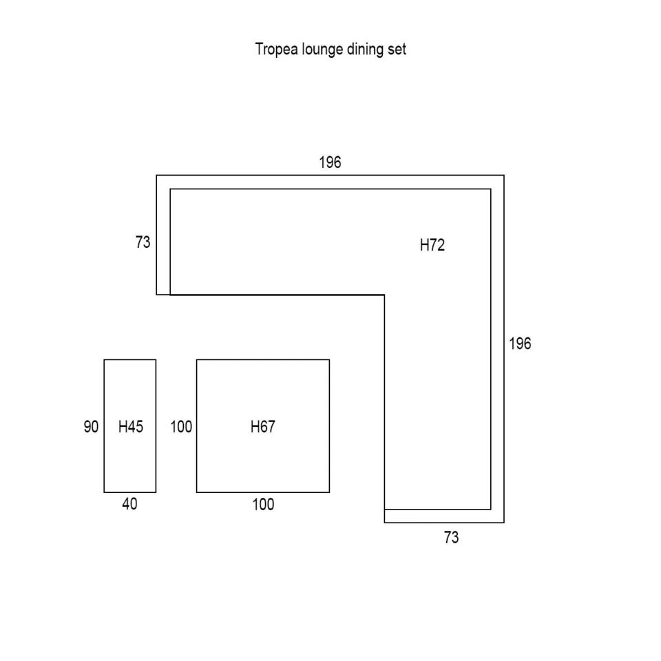 De tafelpoten dienen aan het tafelblad gemonteerd te worden en de loungebanken aan elkaar. De comfortabele Tropea lounge dining set bestaat uit vijf onderdelen. Dit zijn een hoekelement met aan beide zijden een tweepersoons loungebank, een lounge dining tafel en een sportbankje.