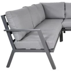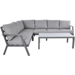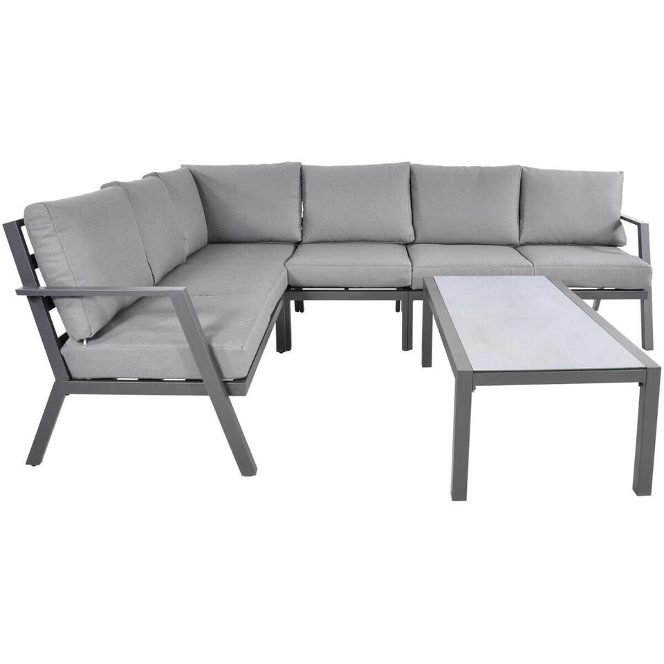 Tijdloos en comfortabel: zo wordt loungehoekset Marah het beste omschreven! Deze loungeset komt uit de collectie van het merk Les en bestaat uit een loungehoekbank (meerdere delen) en één loungetafel. Het frame van zowel de loungebank als de loungetafel is uitgevoerd in onderhoudsvriendelijk en stevig aluminium met een matte donkergrijze kleur als afwerking. Het tafeltje is daarnaast voorzien van een glazen tafelblad met een dikte van 5 mm en heeft een keramiek look. De loungebank is tevens uitgerust met zachte zit- en rugkussens (245gr/m² olefin), zodat u heerlijk kunt relaxen. Plaats loungehoekset Marah in de tuinkamer of onder de veranda en geniet van zijn design en comfort. Ook verkrijgbaar als loungeset. Afmetingen Loungedeel 1-zits zonder arm: B59xD76.50xH78 cm. Loungedeel 2-zits (2x): B122.50xD76.50xH78 cm. Hoekdeel: B76.50xD76.50xH78 cm. Loungetafel: B120xD60xH41 cm.