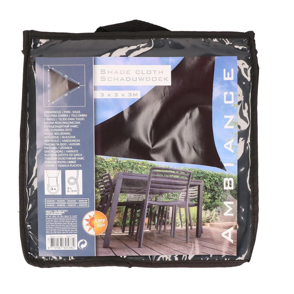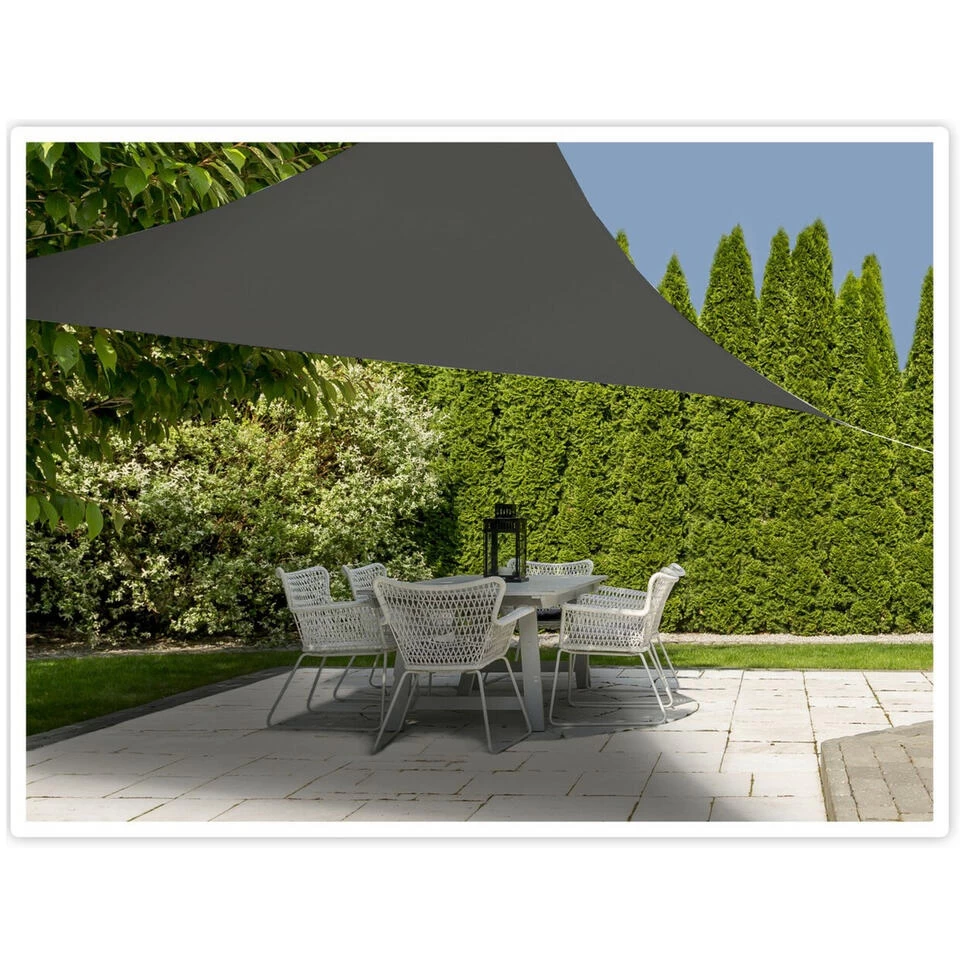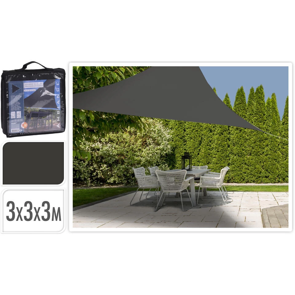 Schaduwdoek/zonnescherm/zonwering driehoek antraciet 3 x 3 x 3 meter. Een donker grijze schaduwdoek van geweven kunststof met een lichte glans, ideaal om een schaduwplek te creeren in uw tuin. Deze schaduwdoek heeft een afmeting van 3 m x 3 m x 3 m van punt tot punt, en een driehoekige vorm. De schaduwdoek biedt bescherming tegen UV-straling en is waterdoorlatend. Wordt geleverd met drie touwen van 350 cm per stuk zodat u deze eenvoudig aan bijvoorbeeld uw schutting kunt bevestigen. Materiaal: 100% polyester. Schaduwdoeken/zonnezeil/zonnedoek/zonwering tuin artikelen en accessoires.