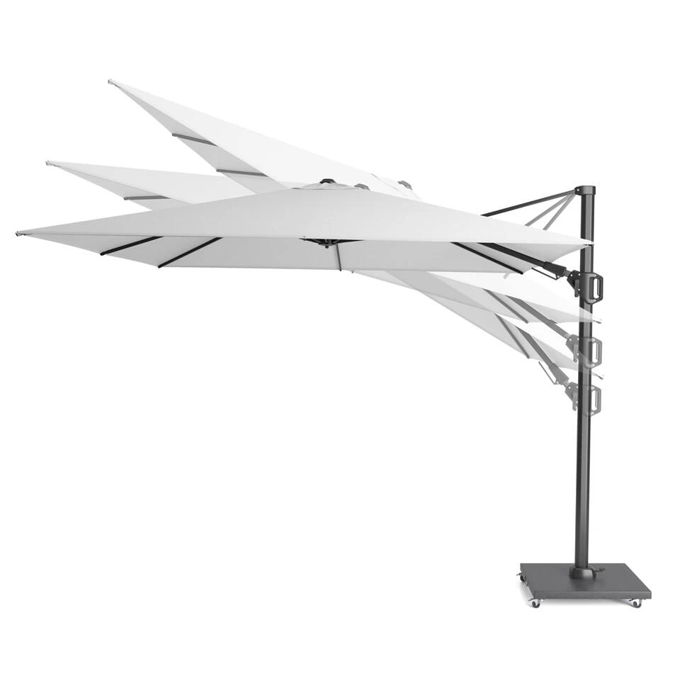 De Platinum zweefparasol wordt standaard exclusief parasolhoes en parasolvoet geleverd. Voor de parasolvoet zijn verschillende optie’s mogelijk. Zo is er een granieten parasolvoet zonder wielen en met wielen. Ook is het mogelijk om te kiezen voor een ingraafparasolvoet.
