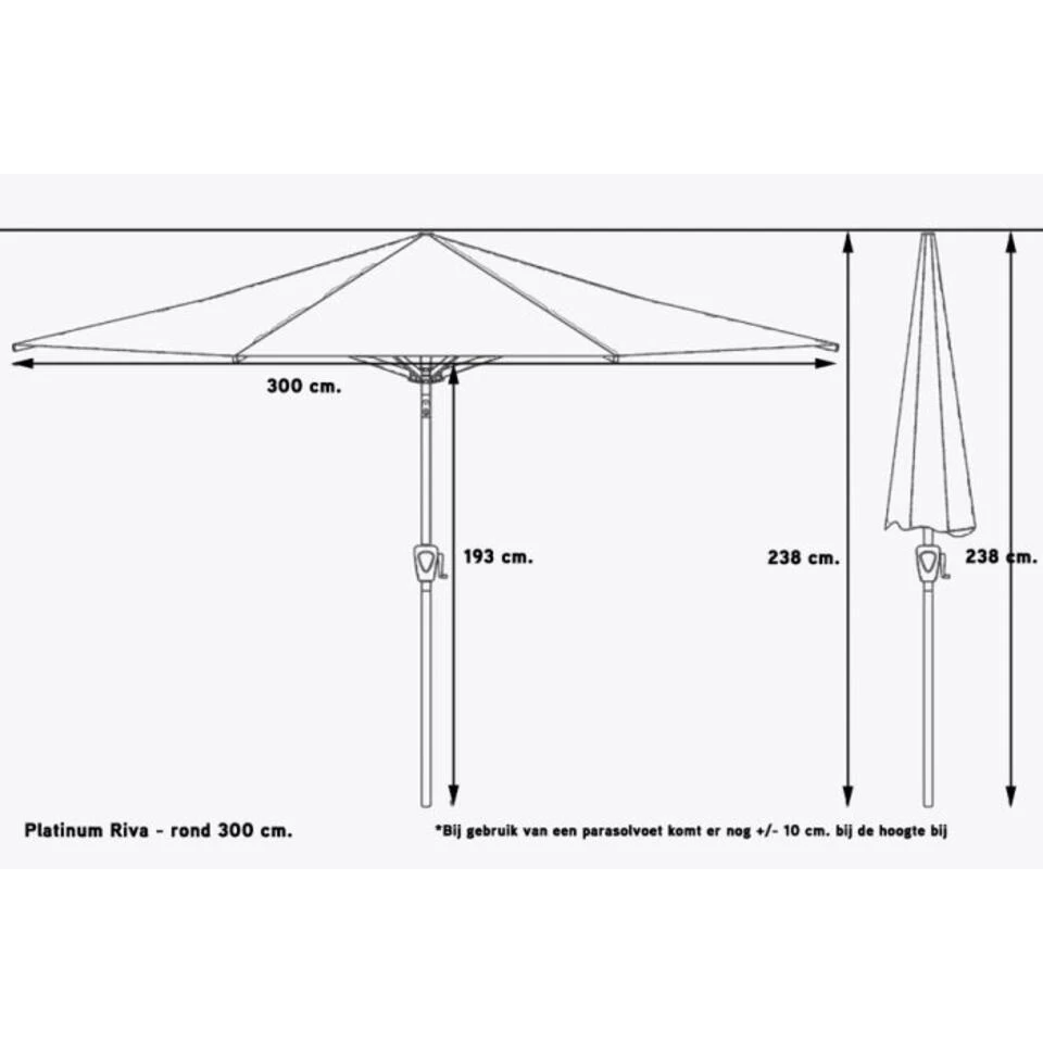 Met de Platinum Riva parasol kan je een heerlijke schaduwplek creëren. De Riva parasol is rond en heeft een doorsnede van 3 meter. Doormiddel van het handige opdraaimechanisme kan je de parasol eenvoudig in- en uitklappen. De mast van de Riva bestaat uit twee delen. Dit zorgt ervoor dat je de parasol uit elkaar kan halen en gemakkelijk kunt opbergen. Het parasoldoek van de Riva parasol 3 meter is licht grijs van kleur. Het doek is van goede kwaliteit, deze is namelijk gemaakt van 100% polyester. Daarnaast is het parasoldoek voorzien van een speciale vuil- en waterafstotende coating. Deze coating zorgt er ook voor dat het doek minder snel van kleur verschiet. Aan het uiteinde van de baleinen van de Riva parasol is een speciale doekspanner gemaakt. Hierdoor staat het doek altijd mooi strak gespannen. De Riva parasol is voorzien van een handig kniksysteem. Hiermee kan je goed inspelen op de stand van de zon. Je kantelt het parasoldoek daarmee namelijk eenvoudig schuin in de baan van de zon. De parasol vangt in de schuine stand wel meer wind. Wij adviseren dan ook om daar goed het oog in te houden.