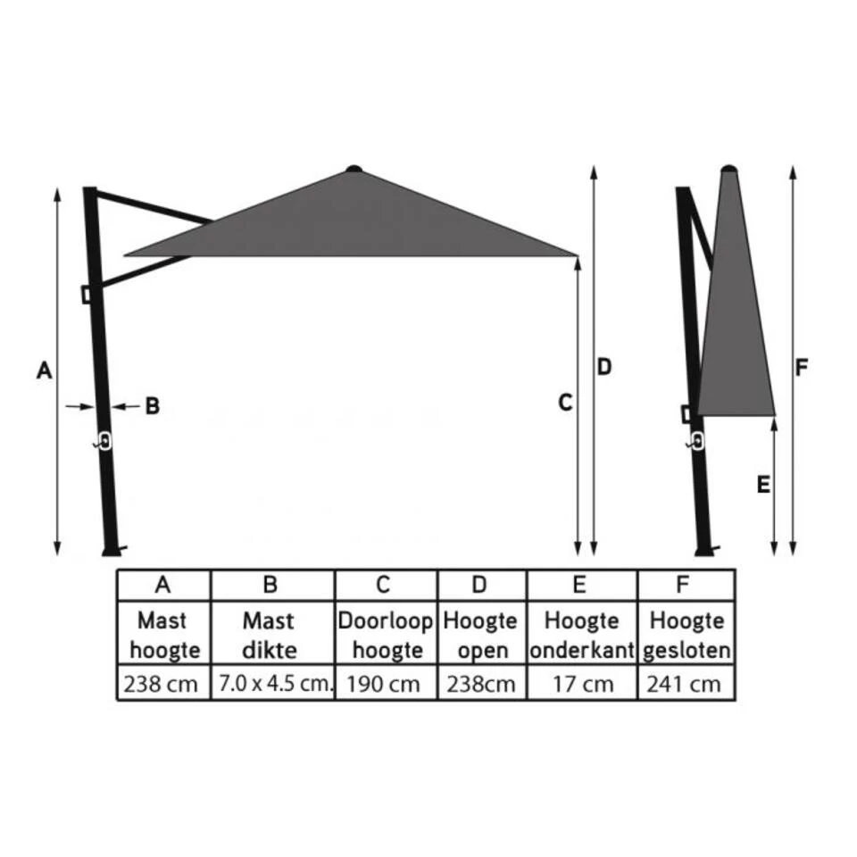 Op zoek naar een zweefparasol met bijpassende voet en hoes? Dan is de Platinum Voyager T1 zweefparasol 3×2 m. een aanrader. Deze grote zweefparasol wordt geleverd met een bijpassende parasolvoet van 90 kg. en een beschermhoes. De voyager heeft een antraciet frame en een grijs parasoldoek. Het frame is gemaakt van aluminium. Dit materiaal is erg stevig en heeft als voordeel dat het niet kan verroesten. Het parasoldoek is gemaakt van 220 grams polyester en is water en vuil afstotend.