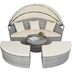 Met dit hoogwaardige aluminium wickerzonne-eiland tovert u uw tuin, terras, wintertuin, balkon of wellnessruimte om tot een feel good-oase. Op zonnige dagen biedt het opklapbare zonnedak een aangename schaduw en bescherming tegen wind. Als praktische zitgroep voor vrienden of om comfortabel op te relaxen. Het wicker zonne-eiland is in een handomdraai omgebouwd.