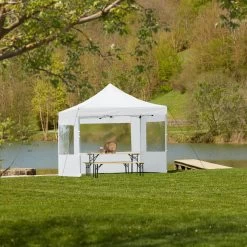 De draagbare partytent van tectake biedt veel ruimte bij weinig gewicht. Met enkele handbewegingen is het lichte schaarframe met een eenvoudig kliksysteem gebruiksklaar. Dak en zijden zijn via haken en velcrosluitingen vast met de robuuste stangen verbonden. Naar behoefte kan de hoogte van het roestvrije en waterafstotende paviljoen aangepast worden. Voor eenvoudig transport of plaatsbesparende opslag kan de klaptent compact in de meegeleverde tas opgeborgen worden. Eenvoudige montage. Eenvoudig transport. Praktische opslag: de flexibele partytent van tectake.