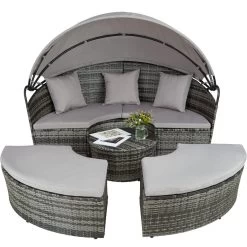 Het functionele ratan zonne-eiland van tectake wordt gekenmerkt door zijn aantrekkelijke design en zijn hoog zit- en ligcomfort. De combineerbare individuele elementen met waterafstotende kussens presenteren zich geheel naar smaak als meerdelige zitgroep of als groot loungebed. Het stabiele zonnedak is bevestigd met kleefsluiting en biedt opgespannen bescherming tegen hitte en wind. Het hoogwaardige vlechtwerk van duurzaam polyratan en het robuuste frame van staal maken dit veelzijdige ratan zonne-eiland van tectake tot het perfecte feel good-oase.