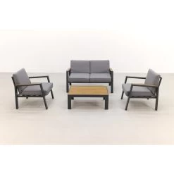 Op zoek naar een stoel-bank loungeset met een stijlvolle uitstraling? Dan is de Monta loungeset wellicht iets voor jouw. De stoel-bank loungeset is gemaakt van degelijk aluminium, de armleuningen en het tafelblad zijn voorzien van een houtlook waardoor de loungeset een warme uitstraling krijgt. De Monta stoel-bank loungeset biedt plaats aan 4 personen. Dankzij de comfortabele kussens geniet je van optimaal zitcomfort.