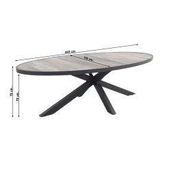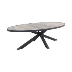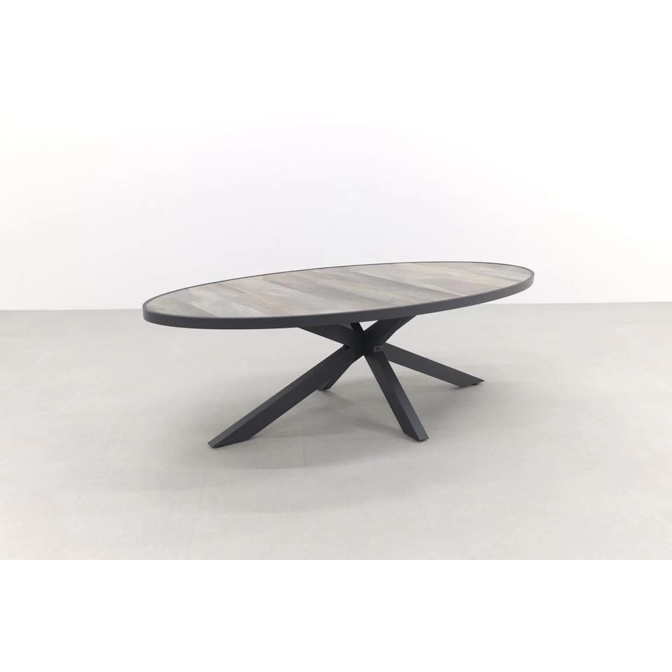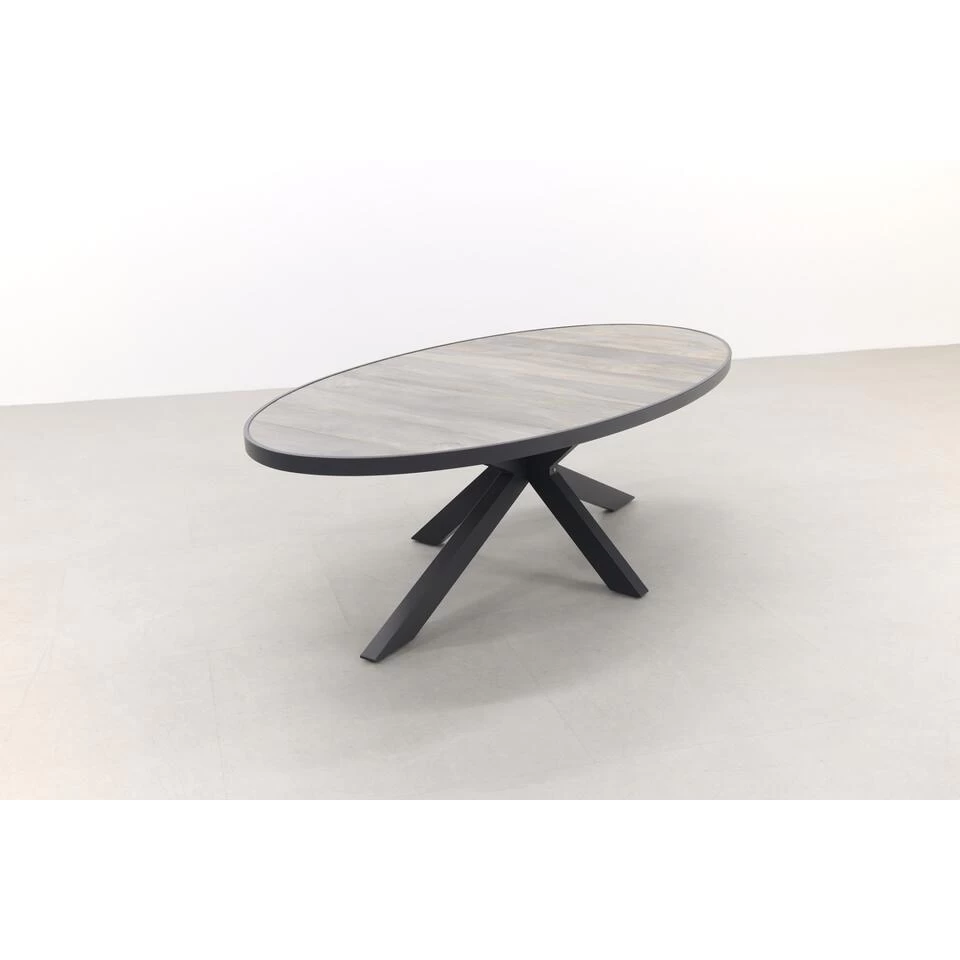 Het ovale blad van de Silva tuintafel heeft een houtlook en is gemaakt van keramiek. Dit biedt niet alleen een stijlvolle uitstraling, maar ook een zeer duurzaam oppervlak dat bestand is tegen krassen, hitte en vorst, zodat de tafel het hele jaar door buiten kan blijven staan. Het aluminium onderstel van de tafel is stevig en onderhoudsarm, zodat je er jarenlang plezier van hebt. De kruisvormige poten van de tafel geven deze een industriële uitstraling, wat perfect past bij een moderne en stijlvolle tuininrichting. Met een afmeting van 240 x 115 cm biedt de tafel genoeg ruimte voor 6 personen om comfortabel te kunnen zitten en te genieten van lange avonden buiten.