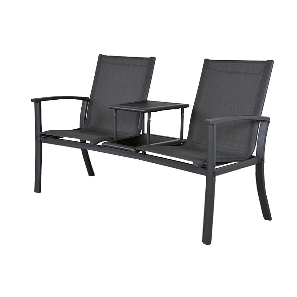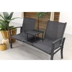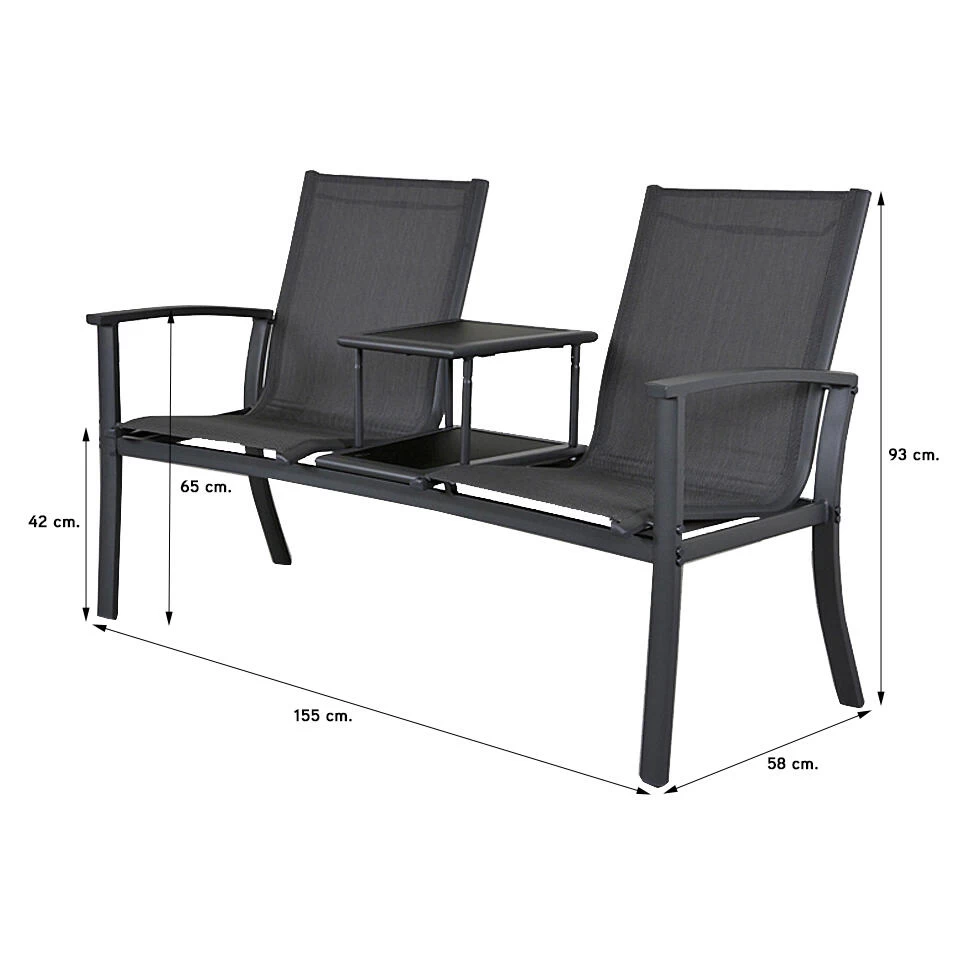 Op zoek naar een mooie tete a tete tuinbank? De Felix tuinbank is dan wat u zoekt. De tuinbank is erg onderhoudsvriendelijk. Dit komt door het aluminium frame en het textileen doek dat hier tussen gespannen is. Dit textileen zorgt er ook voor dat de tuinbank heerlijk zit. Het tafeltje wat tussens de twee stoelen zit zorgt ervoor dat u uw hapje en sapje neer kunt zitten. Het tafelblad, van het tussen tafeltje, is een glasplaat die makkelijk schoon te houden is.