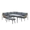 Levering bevat 2 tweezitsbankelement (elk met 1 armleuning), 1 bankelement zonder armleuningen, 1 hoekbankelement, 1 salontafel, 2 hockers, 8 kussens, 8 rugkussens en 6 zitkussens. Opmerking: wij raden aan om de set af te dekken wanneer het regent, sneeuwt of vriest.