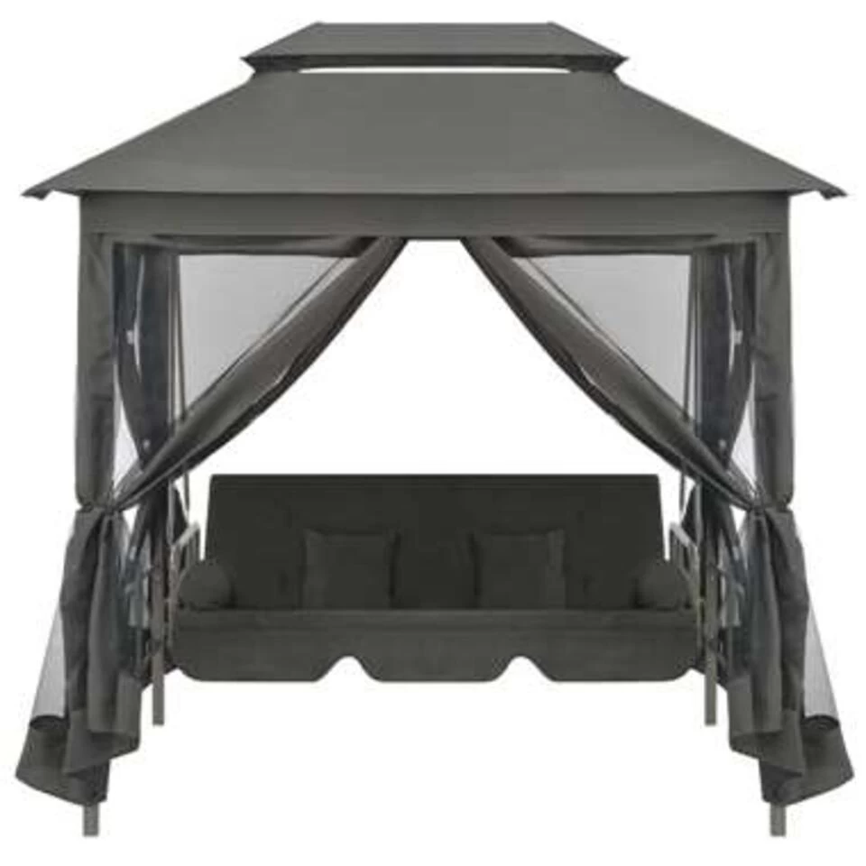Hij heeft een gepoedercoat stalen frame dat zeer stevig en duurzaam is. Dankzij de ingebouwde gordijnen met klittenband, kan je alle 4 zijden gemakkelijk sluiten om een afgesloten gebied te creëren. Het gesloten mesh is perfect om vliegende insecten buiten te houden en je privacy te bieden. De schommelbank kan worden omgebouwd tot een gezellig en comfortabel bed voor een nog meer ontspannende ervaring. Twee rechthoekige kussens en twee ronde kussens zijn inbegrepen voor extra comfort.