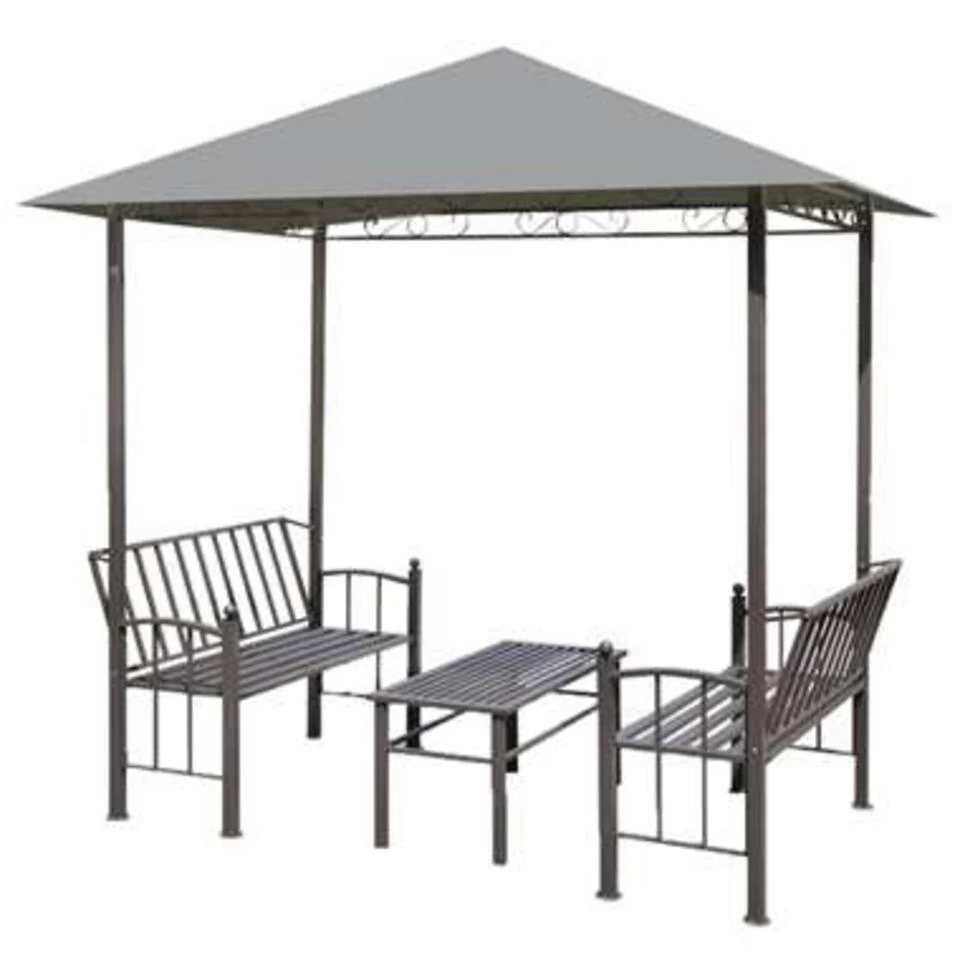 De set bestaat uit een paviljoen met een stevig stalen frame en een waterbestendige en uv-beschermende luifel met versterkte hoeken die jou en je gasten uit de zon houden. De banken en de handige tafel zijn ook gemaakt van staal en zijn zeer duurzaam. De licht hellende rugleuningen van de bank zorgen voor een comfortabele zithouding. De gebogen decoratie op de dakrand geeft het paviljoen een elegante charme.